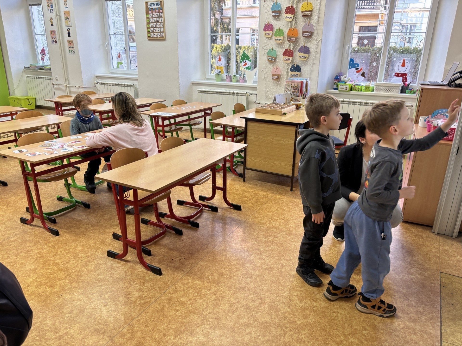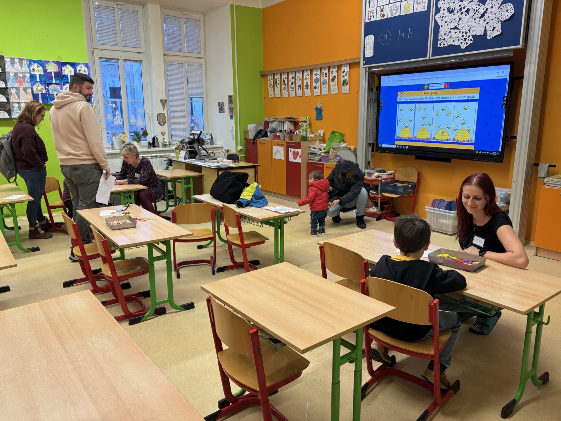 Hlavní program se však odehrával v učebnách, kde na malé objevitele čekalo několik stanovišť zaměřených na hravé učení. Na interaktivních tabulích si děti vyzkoušely moderní výuku, která je moc bavila. Poznávání stejných tvarů a přiřazování správných stínů k obrázkům prověřilo jejich postřeh a soustředění.