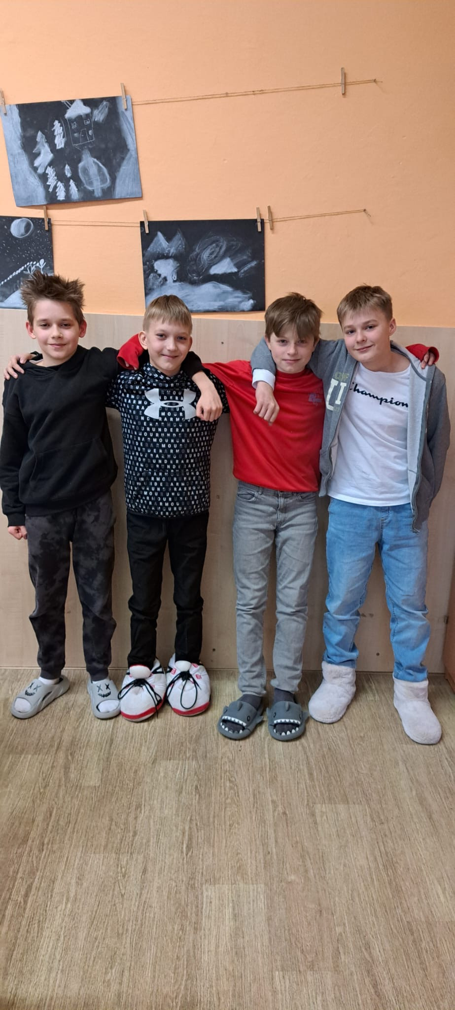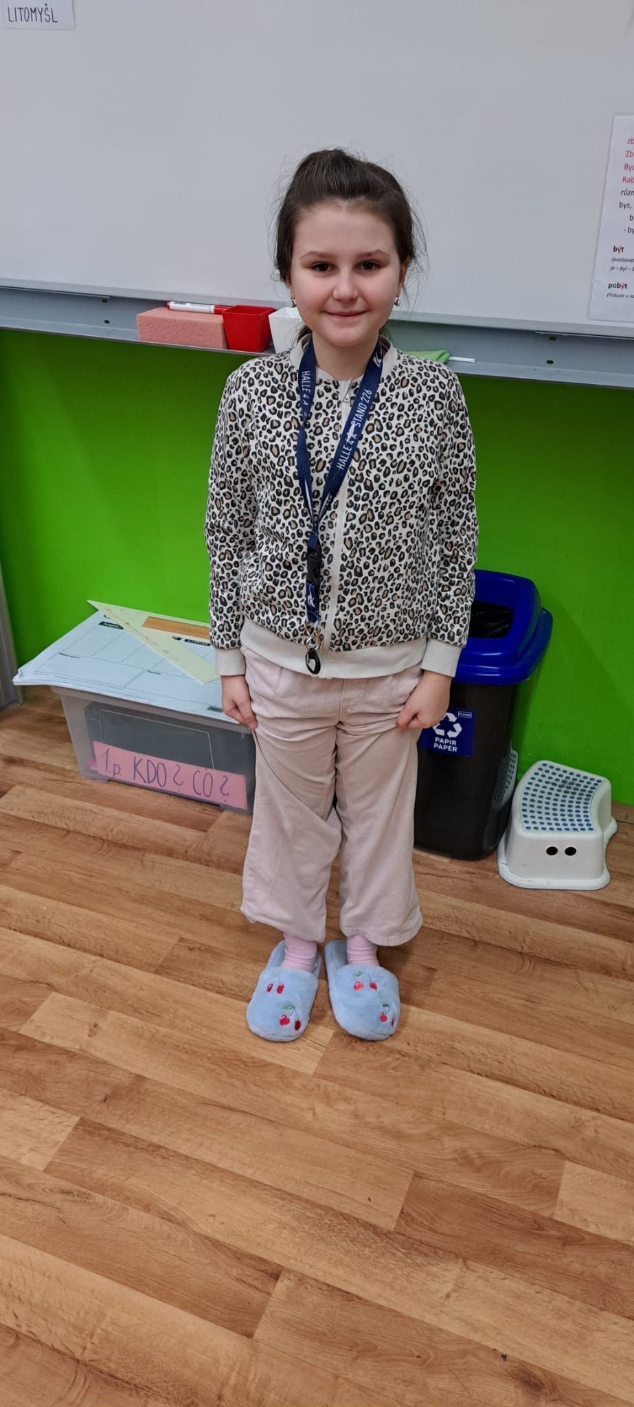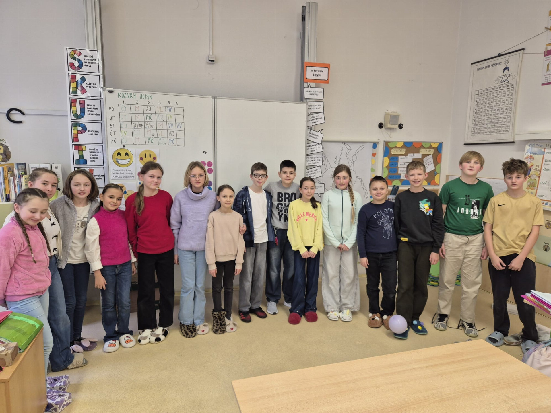 Dnešek byl ve znamení těch nejšílenějších papučí! Žáci dorazili v chlupatých, svítících i vlastnoručně vyrobených nebo ozdobených kouscích. Chodby se proměnily v barevnou a veselou módní přehlídku.
