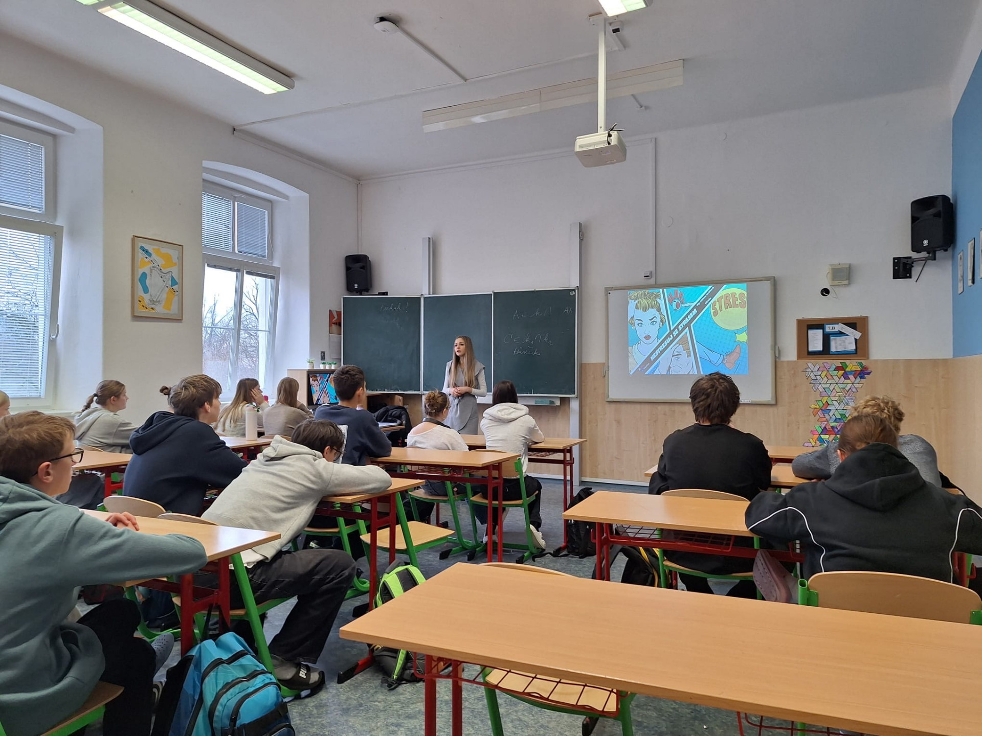 Žáci 9.B se v úterý 27.1.2026 zúčastnili besedy Nestresuj se stresem. Během dvou vyučovacích hodin se seznámili s tím, co je stres, jak se projevuje a jak s ním pracovat. Naučili se i techniky, které mohou použít, když jsou ve stresu.
