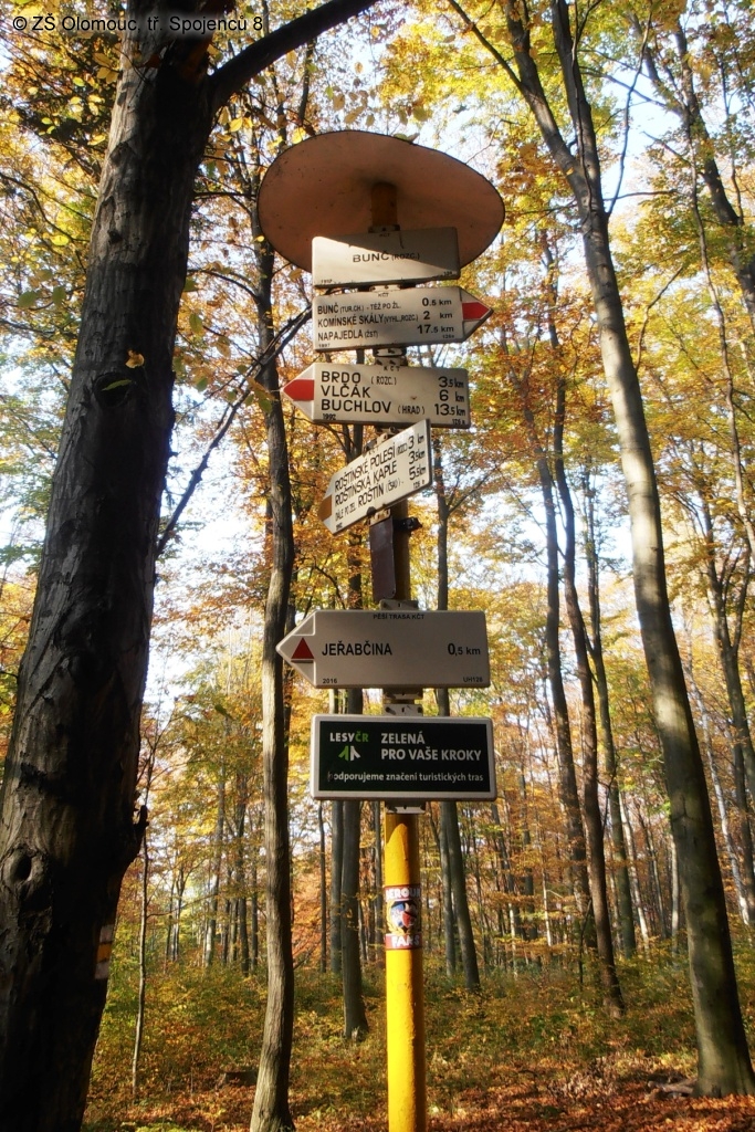 Ve čtvrtek 19. 10. 2017 se po tříleté pauze opět vracíme do terénu v rámci projektu „Zdolávání moravských horských met“. Zájem o akci předčil veškerá naše očekávání, a tak vyrážíme v počtu 45 žáků a tří učitelů do horského pásma Chřibů nedaleko od Kroměříže. Po odjezdu z Olomouce vycházíme v 9:15 hod. z Cetechovic nahoru směr samota Vlčák. Obloha je zprvu zatažená, ale postupně se mraky trhají, a tak si užíváme posledních podzimních slunečních paprsků. Vzhledem k tomu, že nás netlačí čas, zařazujeme do programu neplánovaný sestup ke Gavendově skále a asi pětikilometrovou okružní cestu v okolí Vlčáku. Potom již pokračujeme k hlavnímu cíli naší cesty, a to na vrchol hory Brdo s kamennou rozhlednou. Rozhled z nejkrásnější rozhledny Zlínského kraje a z výšky 587 m rozhodně stojí za návštěvu. Vzhledem k tomu, že všichni začínají být vyhládlí, pokračujeme k závěrečnému bodu naší cesty, k tradičnímu lesnímu penzionu Bunč. Cesta ubíhá v pohodě a klidu, a tak za družného hovoru přicházíme, i s kotětem, které nás doprovází od počátku, okolo 14:15 k závěrečnému cíli. Do Olomouce jsme se vrátili v 16:15 hod. Dospělácký doprovod zajišťovala paní učitelka Romana Hanzelková a páni učitelé Miroslav Navrátil a Jiří Fleško.