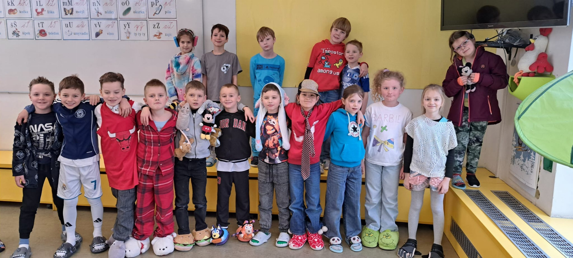 Dnešek byl ve znamení těch nejšílenějších papučí! Žáci dorazili v chlupatých, svítících i vlastnoručně vyrobených nebo ozdobených kouscích. Chodby se proměnily v barevnou a veselou módní přehlídku.
